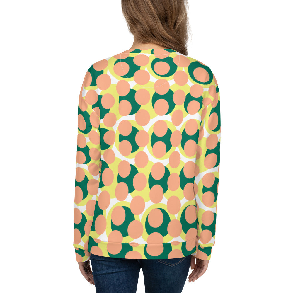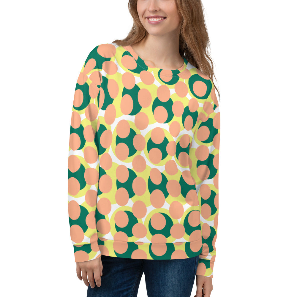 Trendy women's sweatshirt with unique abstract circle print in mandy pink and vibrant colors. Soft brushed fleece inside and comfortable fit for all-day wear. Made from recycled fabrics for sustainable style without sacrificing comfort. Perfect for casual outings or cozy days at home.