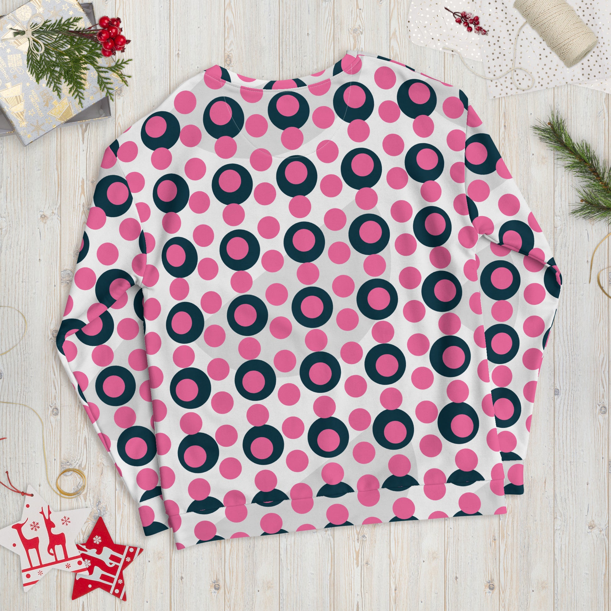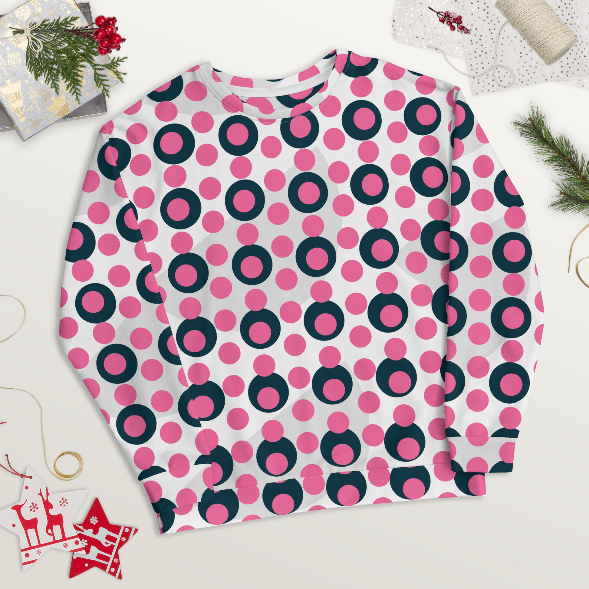 Women’s sweatshirt in vibrant rose pink with eye-catching circles and polka dot print. Soft, cozy fabric and a flattering fit make it perfect for casual wear or cozy days at home. Made from recycled materials for sustainable, stylish comfort.